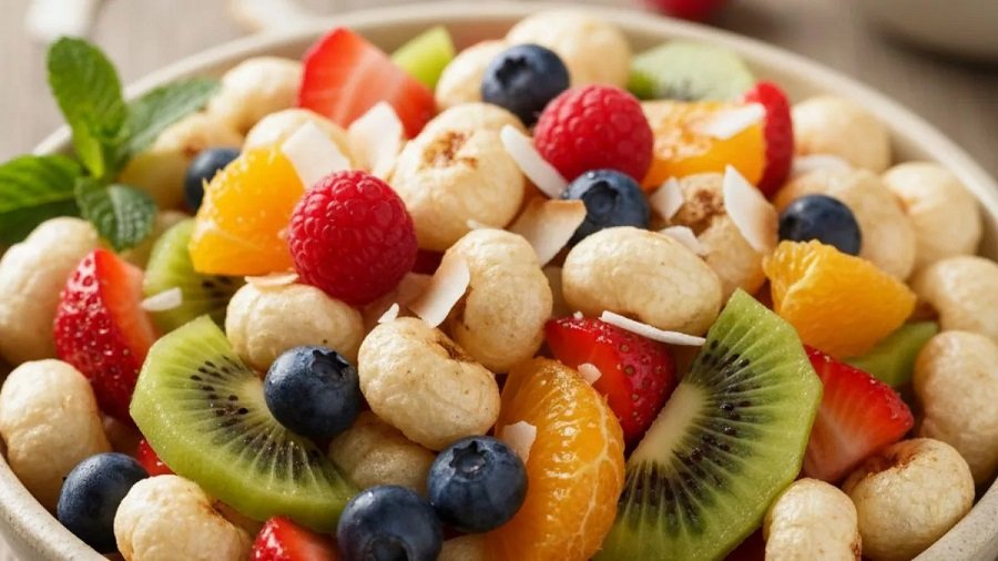 फलों के स्वाद के लिए, दूध को गाढ़ा होने तक उबालें। दरदरा पिसा हुआ भुना हुआ मखाना, इलायची पाउडर, चीनी और मीठा मावा डालें। रंगीन और पौष्टिक कस्टर्ड के लिए सेब, केला, पपीता या अंगूर जैसे उष्णकटिबंधीय फल मिलाएँ।