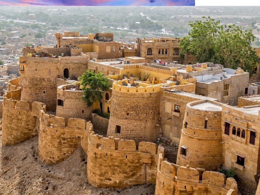 जैसलमेर किला - सोनार किला, जो अपनी सुनहरी रेतीले पत्थरों से बना है।
